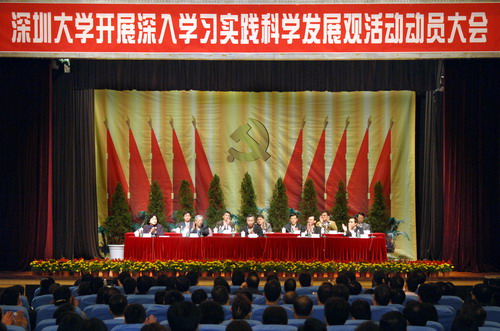 我校深入学习实践科学发展观活动正式启动。3月12日上午,我校在国际会议厅召开了“深圳大学开展深入学习实践科学发展观活动动员大会”,省委第二批深入学习实践科学发展观活动指导检查组第11组组长郭斯淦、组员林柏春,我校党委书记江潭瑜,校长章必功,党委副书记陶士平、陶一桃,副校长阮双琛、邢锋、陈思平、李永华、李凤亮出席会议,我校副处级以上干部、各基层党委(总支)委员、纪委委员,各党支部书记及学生党员代表共400余人参加了大会。动员大会由章必功主持。