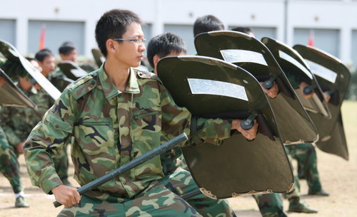 在雄壮的军队进行曲中,护旗队迈着整齐有力的步伐,顺利出色地完成迎军旗仪式。章必功校长在柴金龙政委的陪同下,走向新生的方队进行检阅。检阅完毕,各方队依次走向阅兵台,以铿锵的步伐、嘹亮的口号以及高昂的士气向学校领导和老师汇报军训14天以来取得的丰硕成果。分列式表演结束,由196名男学员组成的擒敌拳表演方队、64名女学员组成的警棍盾牌操表演方队等各表演方队也一一进行了精彩表演。其中,团队拓展训练项目――同心圆的汇报表演展示了学生们在军训中团结一致、共同奋进与相互信任的团队精神,团队拓展培训师首次走进军营取得的成功赢得了在场领导、老师和学员们的高度认同,场内掌声不断。