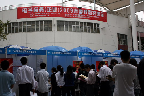 2月28日下午,学生活动中心广场人头攒动,气氛热烈。由深圳大学管理学院与深圳市电子商务协会主办,校招生就业办公室协助、指导的“电子商务(企业)2009春季校园招聘会”在我校举行。