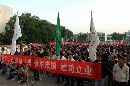 学校武装部负责人介绍了我校今年征兵工作的情况。深圳大学一直重视国防教育,为了更好地完成好征兵工作,学校成立了以党委书记、校长为组长,主管武装工作的党委副书记和主管学生工作的副校长为副组长,成员包括学校武装部、党办、校办、宣传部、财务处和各学院领导的征兵工作领导小组,为今年征兵工作打下了坚实的组织基础。通过一系列宣传发动工作,使征兵政策深入人心,充分调动了全校学生关心国防、报名参军的积极性。学生参军热情极其高涨,各级电视台、报纸、电台都对深圳大学的征兵工作作了连续的报道和高度的肯定。整个报名期间,学生热情高涨,共283人报名,72人(其中26名女生)参加体检,合格40人(其中14名女生)。
