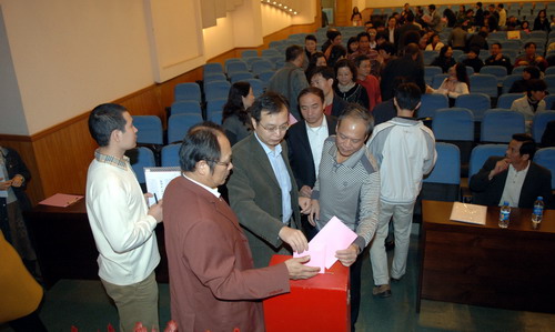 6日上午,代表大会再次召开全体代表会议。从实际情况出发,本次教代会本次特别会议只表决三个主文件,即三类《聘任条例》。共发放选票171张,回收有效票165张,其中赞成票132张,反对票23张,弃权票10张。方案三个主条例票决顺利通过。余下《应聘条件》、《考核办法》、《组织规程》、《工作量规定》的修订文本于两周后送达代表,由代表征求意见,于12月最后一周再次召开特别会议审议表决。若《工资方案》准备就绪,下次会议一并讨论。