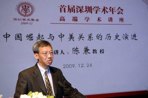 “中国的崛起是中国的大事,是中美关系的大事,也是世界的大事。”12月24日下午,美国康奈尔大学讲座教授陈兼应我校邀请,以“中国崛起与中美关系的历史演进”为题,在国际会议厅为广大师生作学术演讲。这是由深圳市委宣传部、深圳市社科联、深圳报业集团等单位联合主办的首届深圳学术年会三场高端学术讲座的最后一场,国际会议厅内座无虚席。讲座由副校长李凤亮主持,校党委副书记陶一桃致欢迎辞并向陈兼颁发特约教授证书。