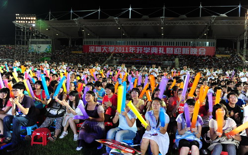 金秋九月,惠风和畅,荔园添新,欢聚一堂。9月14日晚,深圳大学田径场灯光闪耀,掌声雷动,我校2011年开学典礼暨迎新晚会在这里隆重举行。伴着激扬的旋律,第二十六届世界大学生夏季运动会开幕式“深大元素”再次精彩亮相,标兵、旗手、执旗手立于场内两侧挥舞双臂,尽情鼓掌。90名开幕式“鲜花少女”在舞台上踏着灯光,舞动 《鲜花礼赞》,讴歌生命,赞美青春,引起了新生们的阵阵喝彩。校领导江潭瑜、章必功、陶一桃、阮双琛、邢锋、李永华,中国工程院院士牛憨笨、中国科学院院士倪嘉缵,各学院、各机关单位、教研教辅单位的负责人,学生家长代表及2011级全体新生出席典礼。