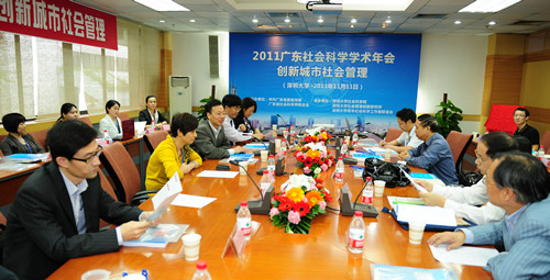 11月11日下午,2011广东社会科学学术年会深圳大学分会场在深圳大学图书馆二楼举行。广东省社会科学界联合会专职副主席林有能,东莞市社会科学界联合会主席王思煜,广东省青年社科工作者协会副会长贾海薇,我校副校长李凤亮、社科部相关负责人以及全省各高校等单位近60名专家学者出席会议。