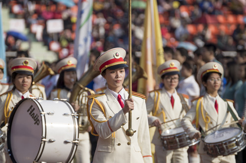 军乐团奏响激昂的乐曲引领各学院运动员入场,运动员们身着颜色各异的30周年纪念衫,集合在主席台前,接受检阅,充分展现出深大学子们朝气蓬勃、意气风发的青春风貌。整队完毕,全体起立,奏唱国歌。