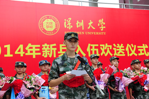 来自文学院的入伍学生代表汪雍博在欢送仪式上发言。他表达了报效国家,为母校、为父母争光的决心。他说,我们以军人为荣,更以深大学子为荣。我们已做好牺牲准备,这是我们的责任和义务,请党和国家放心。