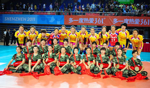 不同于以往的健身操表演,本场比赛的“啦啦队”来自全国公安边防首支腰鼓队——武警边防总医院腰鼓队。赛场上,武警官兵长舒彩带,和着锣鼓节奏尽情演出,赢得了参赛球员和在场观众的阵阵欢呼。