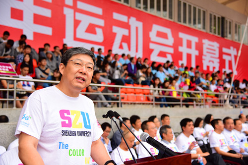 12月1日上午,深圳大学元平田径场人潮涌动,彩旗飘扬。我校在此举行2015年深圳大学综合运动会开幕式,全体在家校领导,各学院、各教研教辅单位,机关各部、室负责人以及数千名荔园师生参加仪式。开幕式由副校长徐晨主持。