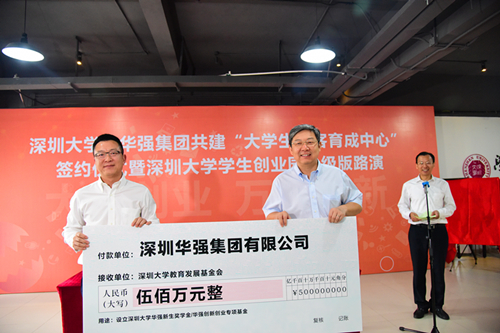 在改造升级后焕然一新的创业园内,举行了深圳大学与华强集团合作协议签署仪式,李曙成代表华强集团向深圳大学赠送捐款支票,李清泉代表深圳大学接受支票。根据合作协议,华强集团在未来5年将向深圳大学教育发展基金捐款2500万元,用于设立“深圳大学华强新生奖学金”和“深圳大学华强创新创业专项基金”并与学校合作建设“深圳大学华强大学生创客育成中心”。