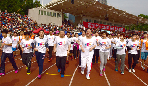 校党委书记刘洪一宣布第三届深圳大学环校彩色跑开始。在一片欢呼声中,刘洪一书记、李清泉校长等校领导及陈梦等我校乒乓球运动员与近五千名师生一同加入彩色跑行列。充满创意的涂鸦T恤、斑斓美丽的彩色粉、青春向上的同学让整个荔园鲜活生动起来。