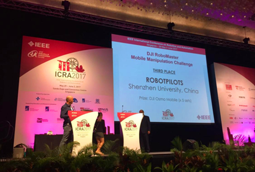 刚刚从新加坡结束的IEEE International Conference on Robotics and Automation (IEEE ICRA)传来喜讯,我校RobotPilots代表队在ICRA Robomaster全球机器人挑战赛获得季军。