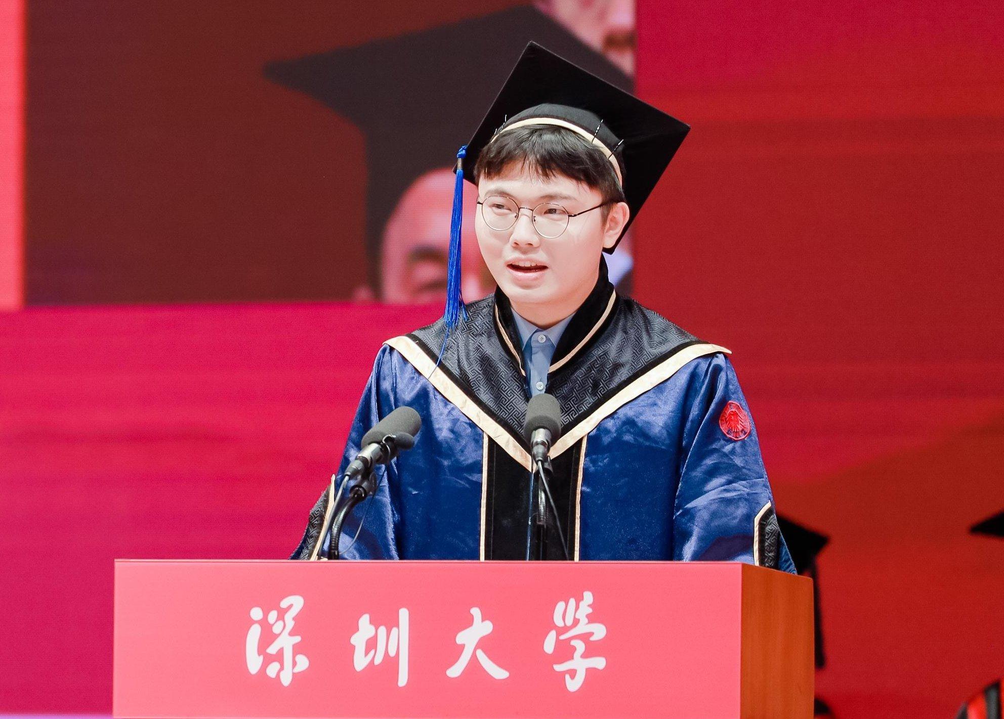 在丽湖校区,医学部本科毕业生郭奕彤作为学生代表发言。郭奕彤回顾大学时期的收获,将试错、沉淀与成长作为自己探索人生的“精进”之道的“关键词”。她结合自己所学药学专业,将人生比作“一场持续不断的药物研发和优化过程”,过程中要经历无数次的失败和调整,需要一颗“抓住机会、敢于试错”的大心脏,每一次的“不放弃”都会在未来的某一刻实现它的价值。她以自己最喜欢的国际象棋为喻,认为与强者对弈是练习直面失败和提高应对复杂棋局能力的好方法。郭奕彤说,许多努力也许短时间看不到成果,但不要灰心、不要焦虑,我们不是没有成长,我们是在扎根。临别,她忆起初到深大的那个十八岁的夏天,再次表达了对母校深厚的情感:“深圳大学,这个永远鼓励我们追梦、给予我们勇气的地方,值得我们用一生去怀念和热爱。”