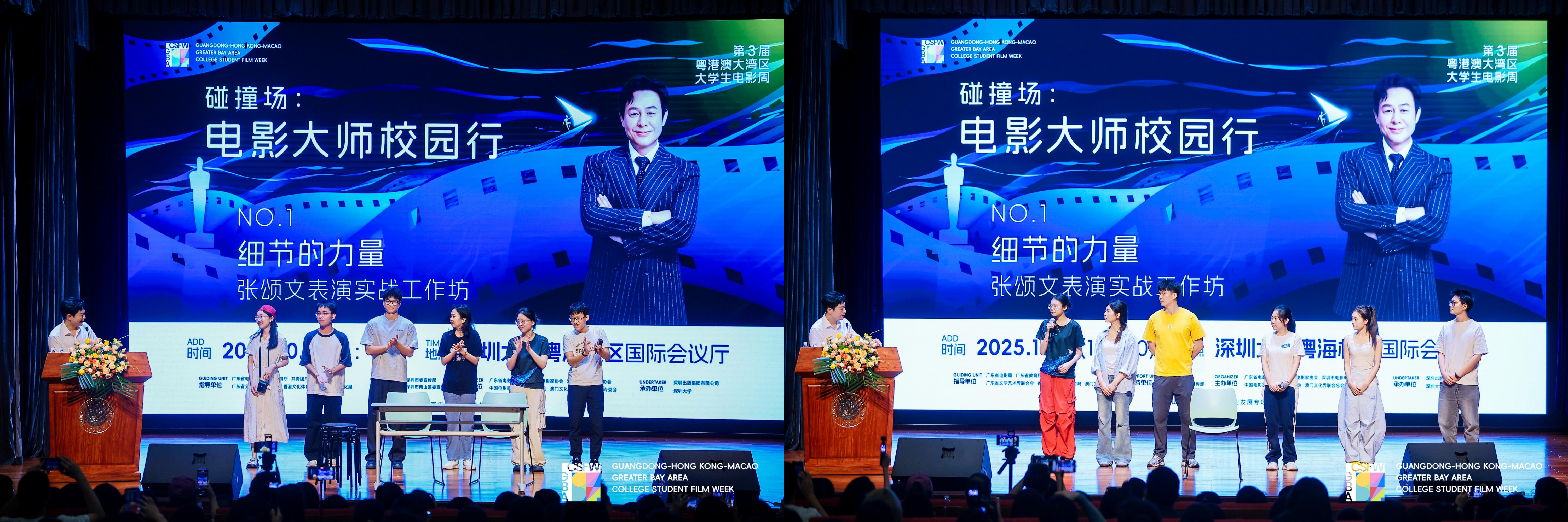 10月19日,第3届粤港澳大湾区大学生电影周“碰撞场:电影大师校园行”首场活动在深圳大学粤海校区国际会议厅举行。演员张颂文以“细节的力量:张颂文表演实战工作坊”为主题,开展沉浸式艺术分享与表演实战指导,通过生活化案例与即兴练习,为高校学子拆解 “艺术源于生活” 的创作真谛,现场掌声不断。