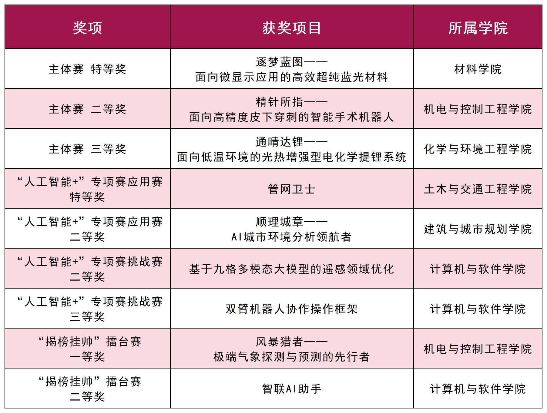 在本届比赛中,深大青年表现优异,刷新深圳大学获奖数历史最好成绩,共计斩获9个“挑战杯”国赛奖项,其中,主体赛特等奖1项、二等奖1项,三等奖1项;“人工智能+”专项赛应用赛特等奖1项、二等奖1项,“人工智能+”专项赛挑战赛二等奖1项、三等奖1项;“揭榜挂帅”擂台赛一等奖1项、二等奖1项。