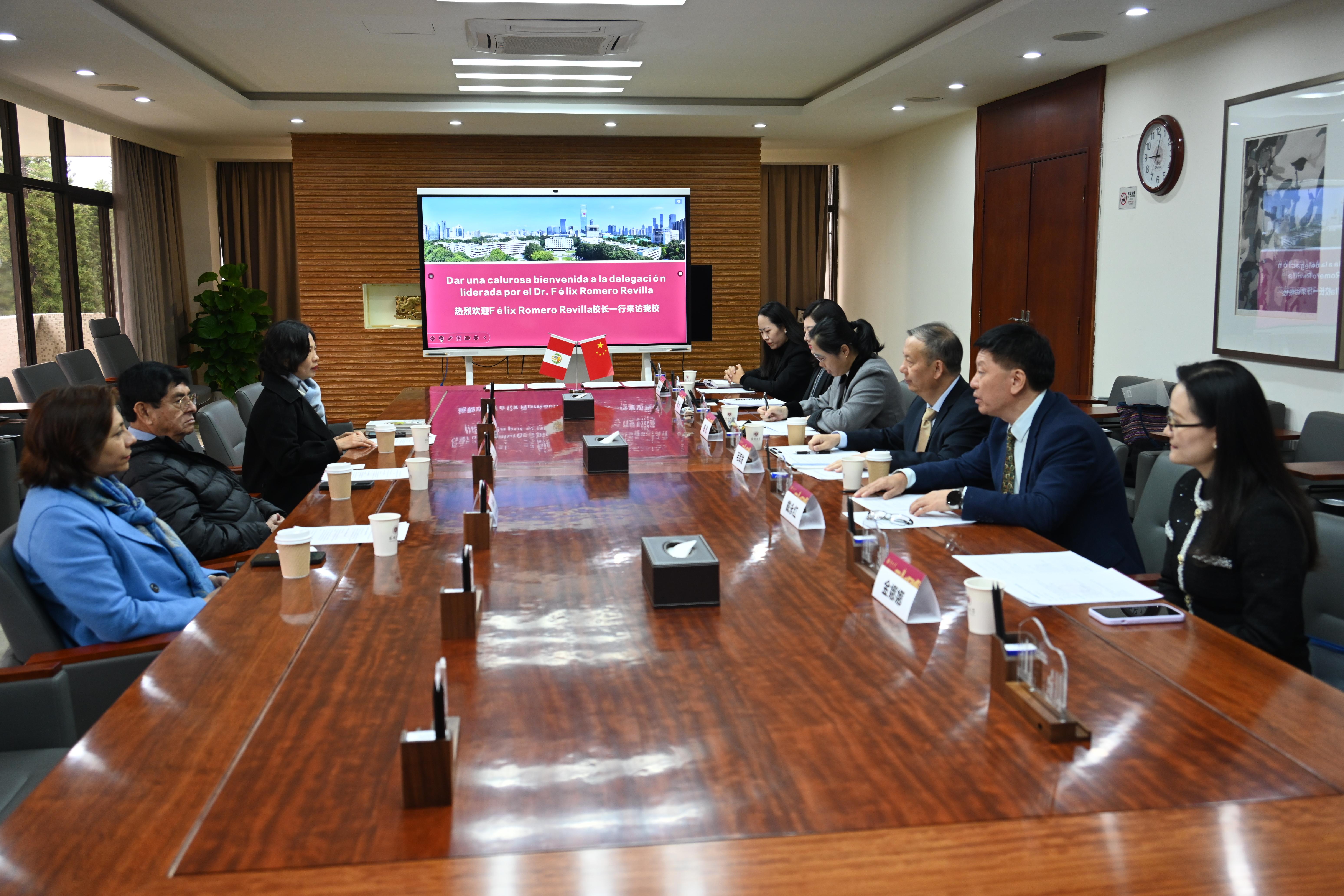 双方就学术合作、学生交流、中拉文化传播项目等展开座谈。秘鲁里卡多·帕尔马大学西班牙语专业负责人、孔子学院外方院长、孔子学院中方院长,深圳大学国际交流与合作部、外国语学院负责人参加座谈。