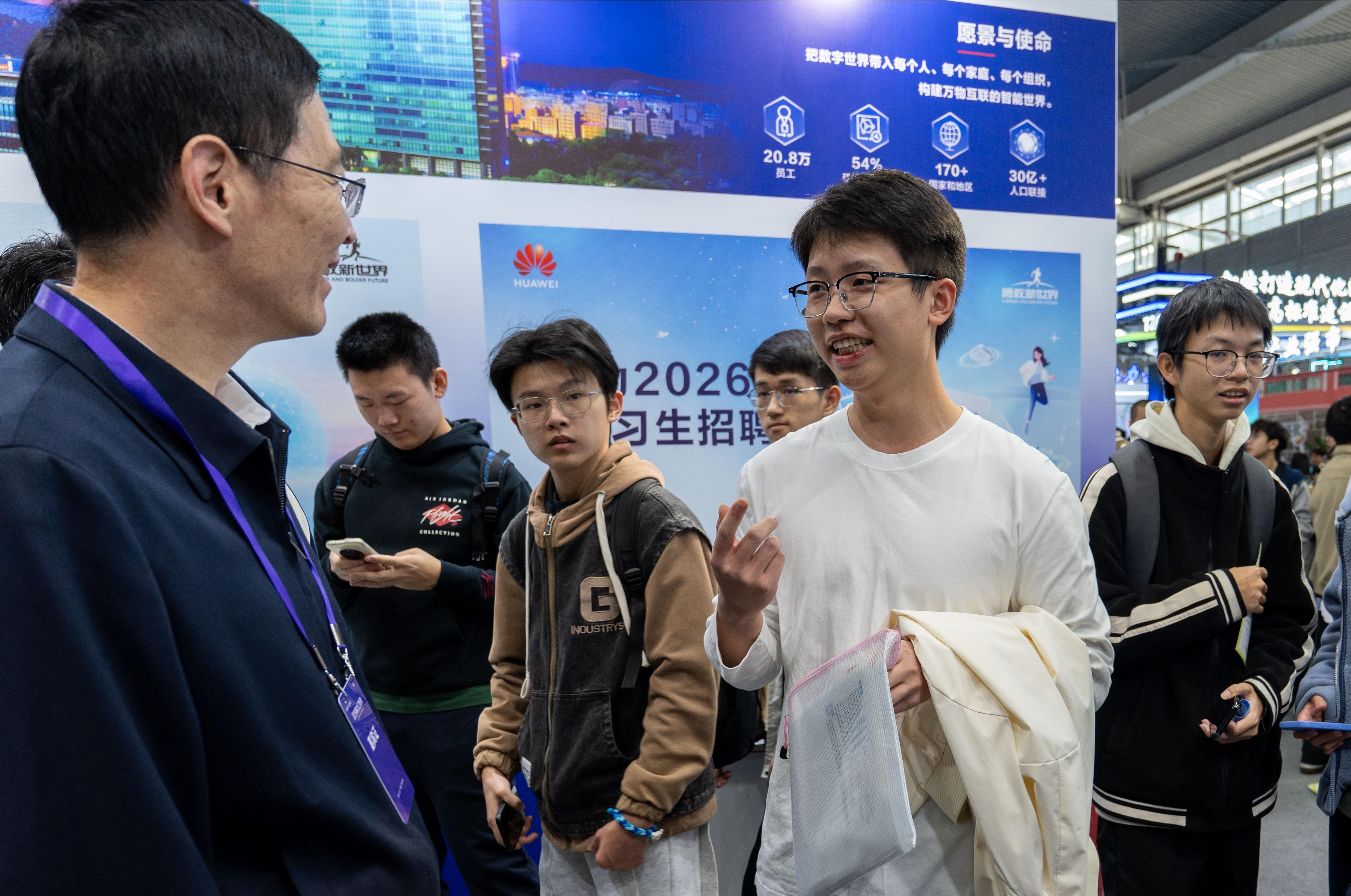 在华为的招聘展位前,徐波一行与该企业招聘负责人展开交流,了解深大毕业生就职和应届生求职情况。他表示,深大与华为已形成了密切的校企合作关系,期待双方未来能进一步协同拓展人才培养的空间。在现场,徐波与电子与信息工程学院的赵同学等多位前来应聘的学生亲切交流。他仔细询问求职学生的情况:“就读的什么专业?是否找到匹配度合适的岗位?与意向单位沟通顺利吗?”他勉励学生夯实专业基础,主动了解行业动态,为未来的职业发展做好准备。