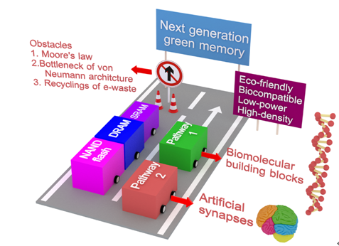 存储器是一类具有记忆功能的电子元器件,在半导体领域受到广泛的应用。受限于摩尔定律和传统冯诺依曼结构瓶颈,近年来存储设备的发展明显放缓。如何突破这些限制,制备性能更优异的存储器具有重要的研究价值。源于自然,模仿自然,超越自然为科学发展提供了一种重要思路。本文创新性地提出了从生物视角解决存储器发展中遇到的问题,从生物基存储器和人工突触两个方面详细的阐述了生物存储器在非易失型存储设备中的理论研究和实际应用价值。