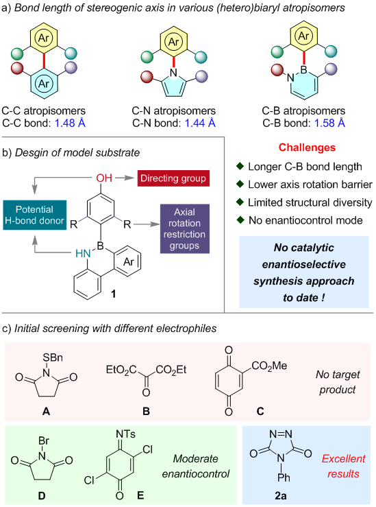 轴手性分子骨架作为手性分子的一类,其结构单元广泛存在于天然产物中,并且在不对称催化、材料科学和药物化学等领域也应用广泛。近年来,轴手性化学领域获得了迅速发展,但是碳-杂原子轴手性领域进展缓慢。种类多样性的限制,制约了其在不对称催化、医药以及材料化学等领域的进一步应用开发。