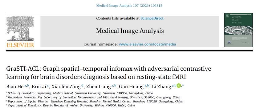 近日,深圳大学医学部生物医学工程学院助理教授张力在国际知名学术期刊Medical Image Analysis(中科院一区TOP,影响因子11.8)发表了最新研究成果,论文题目为 “GraSTI-ACL: Graph Spatial-Temporal Infomax with Adversarial Contrastive Learning for Brain Disorders Diagnosis Based on Resting-State fMRI”。深圳大学2023级研究生何彪为论文独立第一作者,张力为独立通讯作者,深圳大学为第一作者单位及通讯作者单位。