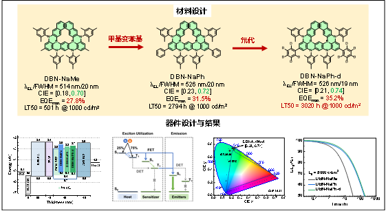成果四:利用“氘代+敏化”策略协同提升绿光OLED器件性能。团队通过“氘代”策略设计兼具高发光效率、高色纯度和良好化学稳定性的发光材料,同时引入商业化应用的磷光材料Ir(ppy)3作为敏化剂,制备敏化型器件。基于该策略构建的纯绿光OLED,EQE高达35.2%,CIEy值达到0.74(非常接近BT.2020绿光的要求),运行寿命(LT50)超过3000小时,为MR-TADF材料的商业化提供了可行路径。论文信息:J.Liu, X. Yin, M. Huang, J. Miao, N. Li,Z. Huang*, C. Yang*,High-performance narrowband pure-green OLEDs with gamut approaching BT.2020 standard: Deuteration promotes device efficiency and lifetime simultaneously,Adv. Mater.2025,37,2411610.(IF:26.8)