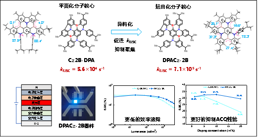 成果三:利用“异构扭曲化”策略提升MR-TADF材料光电性能。通过研究异构体结构与光电性能的关系,团队揭示核心扭曲化可显著增强SOC、缩短激发态寿命,同时拉大分子间距离抑制聚集淬灭(ACQ)。所设计的发光材料DPACz-2B不仅获得高达32.7%的EQE和较低的效率滚降,而且在掺杂比例达到20wt%时仍能保持29.4%的高EQE。论文信息:R.Ming, Z. Xue, Y. Xu, Z. Zhang, Z. Chen, J. Miao,Z. Huang*, C. Yang,Regioisomerization-directed MR-TADF emitters: Enhanced RISC and suppressed aggregation toward high-performance narrowband blue OLEDs,Angew. Chem. Int. Ed.2025,e202516696.(IF:16.9,HotPaper)