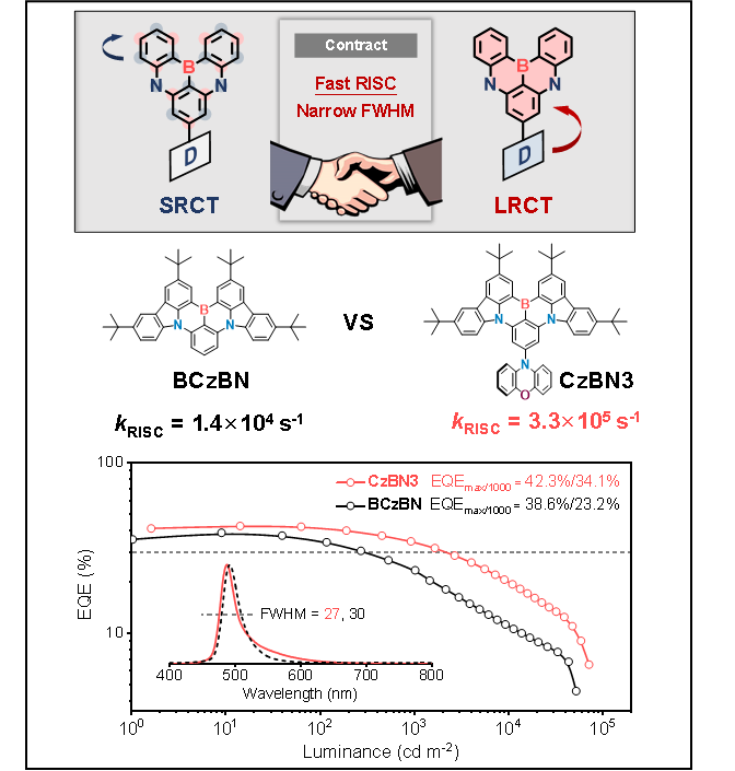 成果二:利用“正交给体”策略提升MR-TADF材料光电性能。为解决硼氮MR-TADF材料反向系间窜越速率(kRISC)缓慢,器件效率滚降严重的问题,团队提出“正交给体”策略:在保证分子最低单重激发态的SRCT特性的前提下,通过正交连接引入长程电荷转移三重态(3LRCT),促进反向系间窜越(RISC)过程。所设计分子CzBN3相较母核BCzBN,kRISC提升超20倍,器件实现仅为27 nm的窄半峰宽,外量子效率(EQE)高达42.3%,并且在1000 cd m-2的条件下,EQE仍达到34.1%。这项工作为开发高性能MR-TADF材料提供了具有普适性的分子设计策略。论文信息:Z. Huang, H. Xie, J. Miao, Y. Wei, Y. Zou, T. Hua, X. Cao*, C. Yang*,Charge transfer excited state promoted multiple resonance delayed fluorescence emitter for high-performance narrowband electroluminescence,J. Am. Chem. Soc. 2023,145, 23, 12550–12560.(IF:15.6,ESI高被引论文,热点论文)