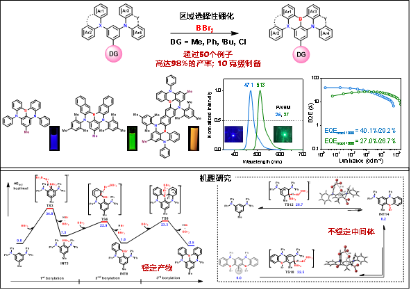 成果一:发展了硼氮多重共振发光分子的合成新方法。针对硼氮稠环材料制备困难的难题,团队发展了导向基定位直接硼化的合成方法,实现了该类化合物的简单高效合成。通过反应机理研究揭示了位置选择性的决定因素,并建立了底物、反应条件与产率之间的关系。基于该方法成功制备出一系列窄谱带硼氮化合物,发射光谱覆盖从深蓝光到红光。这项工作为高性能MR-TADF材料的合成提供了有力支撑。论文信息:L. Wu,Z. Huang*, J. Miao, S. Wang, X. Li*, N. Li, X. Cao, C. Yang*,Orienting group directed cascade borylation for efficient one-shot synthesis of 1,4-BN-doped polycyclic aromatic hydrocarbons as narrowband organic emitters,Angew. Chem. Int. Ed.2024,63,e202402020.(IF:16.9)