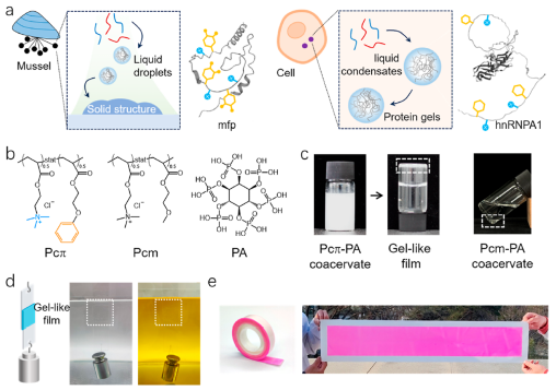 基于这一序列特征,团队创新性地设计了一种疏水聚电解质 Pcπ。这种聚合物具有统计分布的阳离子单体与苯基官能团,完美模仿了IDPs的核心结构特征。为了触发相分离,研究人员选择了具有六个磷酸基团的植酸(PA)作为阴离子分子。PA 能与 Pcπ 中的阳离子通过多重离子键和氢键发生反应,实现相分离与凝胶化过程。进一步的光谱学、流变学与小角X射线散射分析揭示了芳香基团的独特作用。它们通过疏水效应与阳离子-π相互作用显著增强了聚合物与植酸之间的结合,使得体系在高盐环境下依然稳定,并有效延缓液滴的融合过程,最终形成结构致密的凝胶网络。这样的分子机制不仅解释了Pcπ-PA体系特殊的相行为,也为理解天然蛋白质中芳香基团在相分离和凝胶化过程中的关键作用提供了佐证。性能测试显示,Pcπ−PA凝胶薄膜在水下玻璃基底上的黏附强度可达约300 kPa,并且对塑料、金属等多种材料均表现出良好兼容性。更为突出的是,在油性环境中(如玉米油、硅油等),该材料的黏附强度最高可达500 kPa,优于目前报道的大多数同类体系。此外,这种胶膜还具有良好的可加工性,可制成胶带、贴片等实用形态,展现出向临床和工程应用转化的巨大潜力。该研究不仅在性能层面实现了突破,更在理论上深化了对蛋白质液-液相分离与相变机制的理解,凸显了芳香基团在驱动聚电解质凝聚和凝胶化过程中的决定性作用。