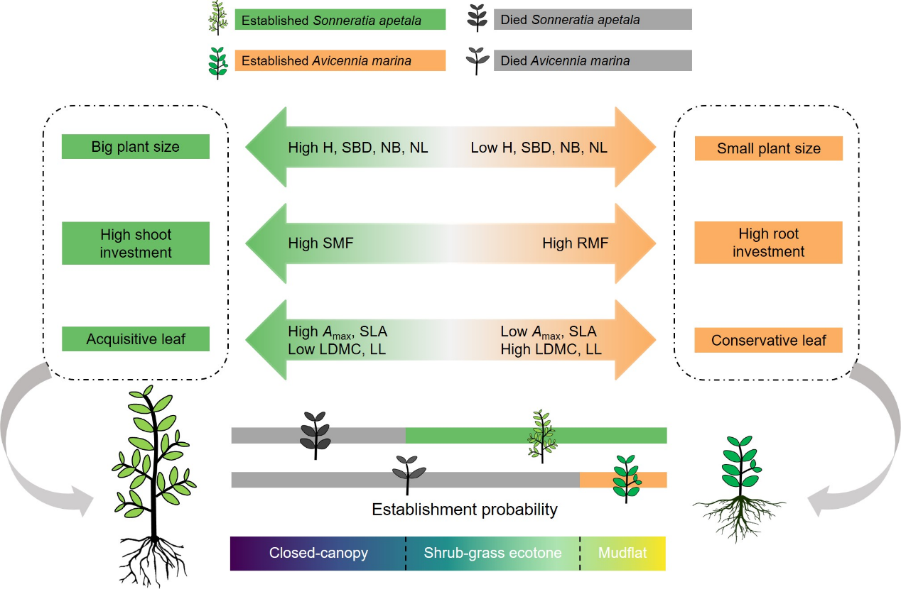 概念图总结了功能性状对光照响应的差异如何驱动外来红树植物无瓣海桑和白骨壤的建植过程以及二者的生长适应策略