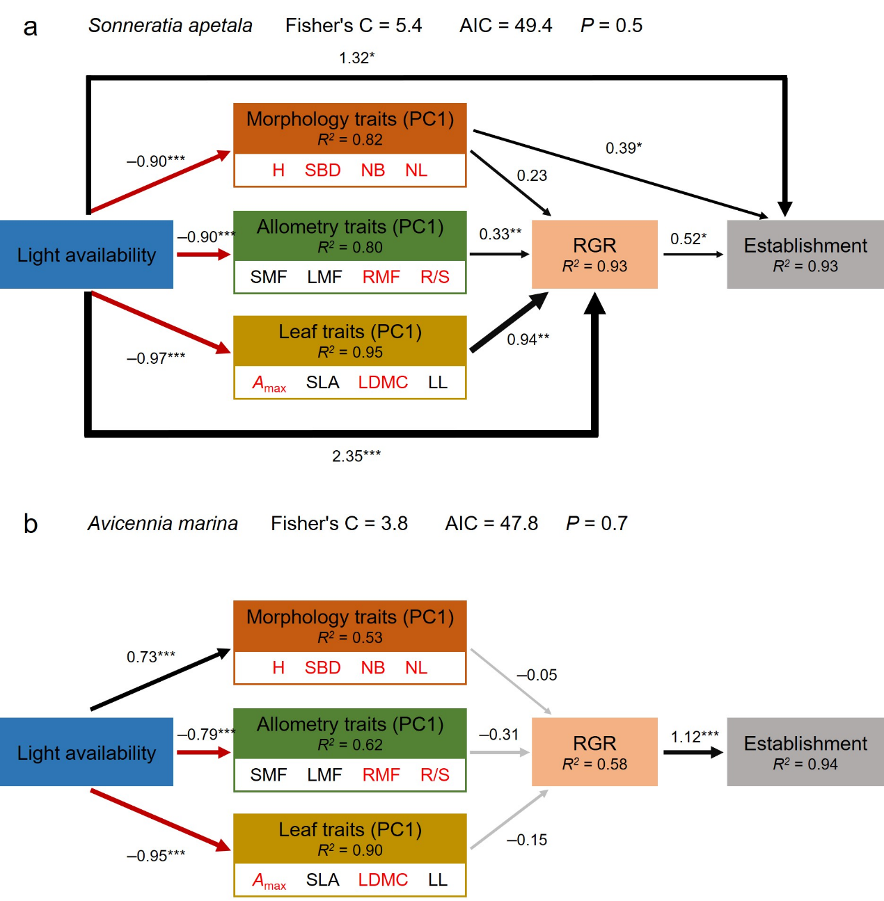 结构方程模型(SEM)揭示光照与植物性状对(a)无瓣海桑和(b)白骨壤相对生长速率及建立过程的直接与间接影响