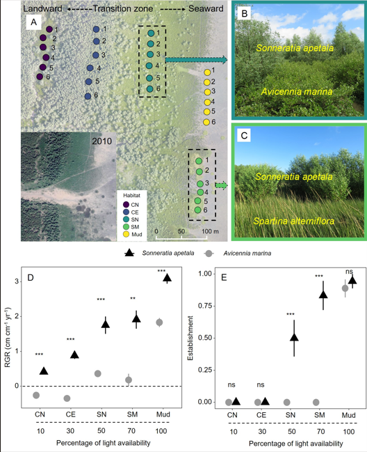 红树林生长分布在高胁迫的生境中,传统观念认为其可以抵御植物入侵(即“红树林入侵抵抗范式”)。然而,外来红树植物无瓣海桑(Sonneratia apetala)正在不断侵占中国南方本土灌丛红树林和互花米草(Spartina alterniflora)丛,形成广布的“盐沼-红树林”交错带。目前,驱动无瓣海桑快速入侵的机制尚不明确。通过在野外不同生境中的移植实验,我们的研究发现:(1)沿不同光照梯度,无瓣海桑的相对生长速率比白骨壤高5–10倍;(2)无瓣海桑在本土灌丛红树林和互花米草丛生境中的建植率超过50%,而白骨壤的建植率为0;两者在郁闭林下生境的建植率均为0。研究结果表明无瓣海桑可以在低光生境中拣植并维持较高的相对生长速率。