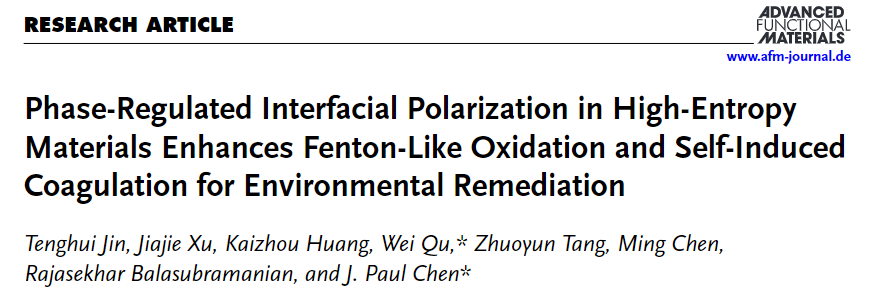 化学与环境工程学院陈嘉平教授团队在Advanced Functional Materials期刊发表题为“Phase-Regulated Interfacial Polarization in High-Entropy Materials Enhances Fenton-like Oxidation and Self-Induced Coagulation for Environmental Remediation”的研究论文,该团队硕士研究生金腾辉为论文第一作者,助理教授屈伟、陈嘉平为论文通讯作者,深圳大学为第一单位。