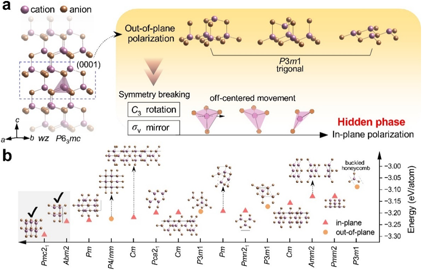 以III-V族材料为代表的纤锌矿(wurtzite, wz)化合物半导体因其独特的四面体配位结构和优异的本征性能,在电子学、压电电子学和光子学等领域中发挥着重要作用。wz晶体天然缺乏中心对称性,因而具有显著的压电效应与自发极化,同时具备高载流子迁移率,优异的热稳定性,并与传统半导体工艺兼容,使其成为高频与射频器件、功率电子器件、非易失性存储以及存算一体架构芯片的核心材料体系。然而,wz材料的铁电应用受限于较高的极化翻转势垒和接近介电击穿极限的矫顽电场。为降低铁电翻转势垒,目前主要有两条研究路径:一是通过合金化、掺杂或应变工程来改性已有的wz材料(如AlN、ZnO);二是探索具有本征低翻转势垒的新型wz型化学体系。该团队研究发现,受到结构对称性的限制,六角相在(0001)晶面只允许面外极化。要实现真正的面内铁电,需要进一步破坏旋转对称性和镜面对称性,使正负电荷中心沿横向产生有效分离。