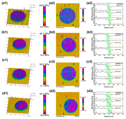 通过AFM DMT模量图谱与微观表征深入揭示了性能同步提升的内在机理:性能跨越的核心在于成功构筑了“梯度模量界面层”。相较于未改性复合材料界面处“断崖式”的模量突变,1.2 wt.% CNTs的引入将界面层厚度调控至约361.4 nm,形成了一个平滑过渡的梯度模量层(见图3),从而显著缓解了高模量纤维与低模量基体间的应力集中。