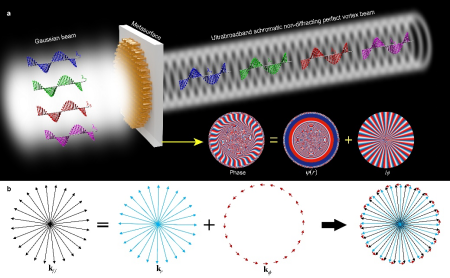 图1 基于超表面径向动量调控实现的超宽谱、无色散、无衍射的完美涡旋光束。