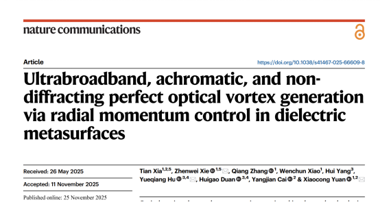 微纳光电子学研究院副教授谢振威、欧洲科学院院士袁小聪教授团队与湖南大学胡跃强教授、段辉高教授团队合作,利用介电超表面器件对光场径向动量进行精细调控,首次成功实现了兼具超宽谱响应、消色差特性和无衍射传播能力的“完美涡旋光束”(Achromatic, Non-diffracting Perfect Vortex Beam, ANPVB)。该工作突破了传统光学涡旋长期面临的三大核心瓶颈:光束直径依赖于拓扑荷、波长相关的色散效应,以及在长距离传播过程中因衍射导致的光束扩散。研究团队创新性地提出基于介电超表面的径向动量调控策略,不仅有效克服了上述限制,还为结构化光技术的实际应用开辟了新路径。相关研究成果以“Ultrabroadband, achromatic, and non-diffracting perfect optical vortex generation via radial momentum control in dielectric metasurfaces”为题,发表于《Nature》旗下综合性顶级期刊Nature Communications