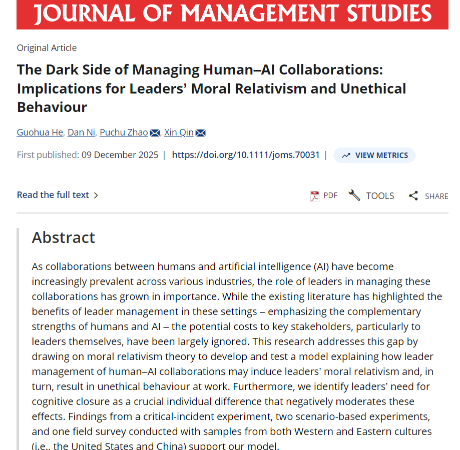 管理学院助理教授何国华的论文“The Dark Side of Managing Human–AI Collaborations: Implications for Leaders’ Moral Relativism and Unethical Behaviour”于2025年12月正式在管理学领域国际顶级期刊Journal of Management Studies在线发表。该论文以深圳大学管理学院为第一作者单位,其他合作者包括中山大学管理学院助理教授倪丹,厦门大学管理学院助理教授赵璞初,以及中山大学管理学院教授秦昕。
